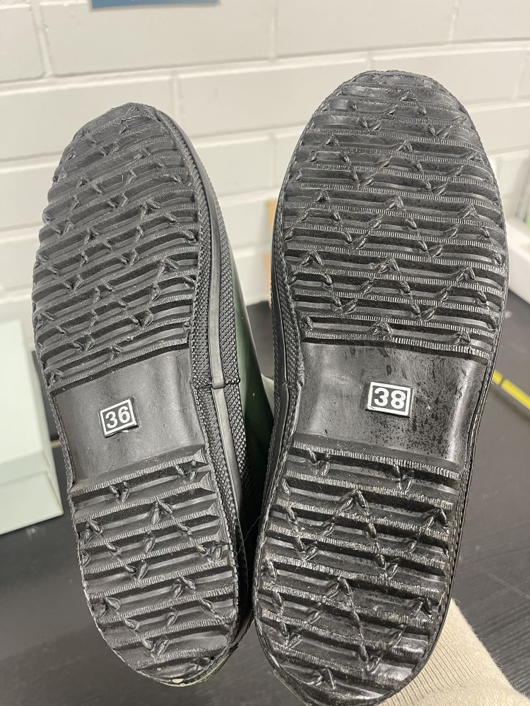 tullut meille valmistajalta näin.Eli jos jalkasi ovat hyvin erikokoiset, vasen isompi selvästi ja oikea pienempi, tästä saisit edullisesti villavuoriset kumisaappaat.