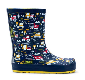 KOEL paljasjalka kumisaappaat luonnonkumista ovat täydelliset pitämään lapsesi jalat kuivina sadepäivinä ja vesilätäkköleikeissä. Näissä on hyvät paljasjalka ominaisuudet; hyvä varvastila ja tasainen pohja, ei kantakorkoa. Pehmeät ja joustavat kumisaappaat kivalla työkone-printillä tuovat iloa lapsen päivään! Kumisaappaat ovat hyvin pitävät, pohja 3 mm ja siinä on 2 mm:n urakuvio. Heijastin takana lisää turvallisuutta.Vuori on polyesterin ja puuvillan sekoitetta.