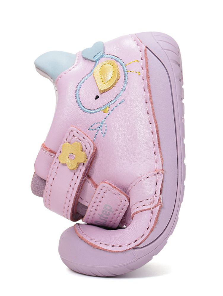 Kivat paljasjalkakengät DD Stepiltä pikkuisille! Väri menee hennosti liilaan ja sivussa ja tarrassa kivat somisteet! Nämä kengät ovat hyvin pehmeät ja erittäin joustavat ja 0-korkoiset. Valmistettu nahasta joka on vettähylkivää, myös nahkavuori. Malli on tilava ja jalkojen muotoa mukaileva. Ulkopohja on superjoustavaa ja pitävää kumia Pohja on ommeltu kenkään ja siksi liimaa on näissä käytetty hyvin minimaalisesti. Irrotettavat nahkapohjalliset.