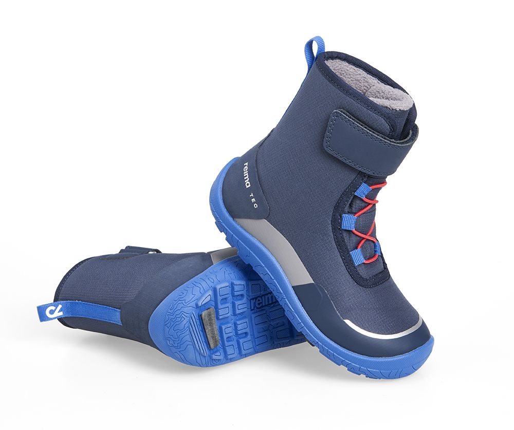 Lämpimät vedenpitävät lasten talvikengät joissa Reiman oma paljasjalkalesti. Taipuisa pohja ja kohokuviot antavat hyvän pidon.